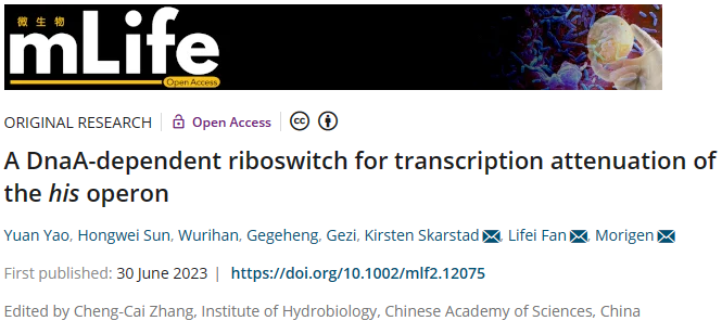 How to cite this article: Yao Y, Sun H, Wurihan, Gegeheng, Gezi, Skarstad K, et al. A DnaA‐dependent riboswitch for transcription attenuation of the his operon. mLife. 2023; 2: 126–140.