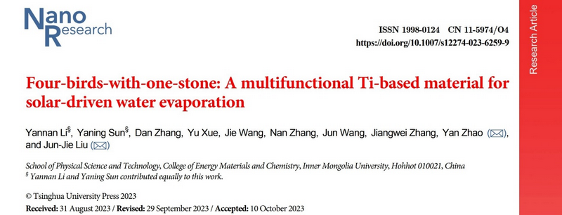Recently, the research team of Prof. Liu Junjie with the School of Physical Science and Technology of IMU(SPST) and Research Fellow Zhao Yan with the College of Energy Materials and Chemistry of IMU(CEMC) has jointly guided the postgraduates to make new progress in the research of solar photothermal conversion materials which have superior antibacterial and antifouling properties. The research result titled “Four-birds-with-one-stone: a multifunctional Ti-based material for solar-driven water evaporation” has been published in the international top journal-Nano Research. Nano Research is an international top academic journal which is administered by the Ministry of Education of P.R.C. and operated by Tsinghua University. It is one of the top-10 journals on the list of “Most Internationally Influential Academic Journals of China”.(URL of the article: https://www.sciopen.com/article/10.1007/s12274-023-6259-9)