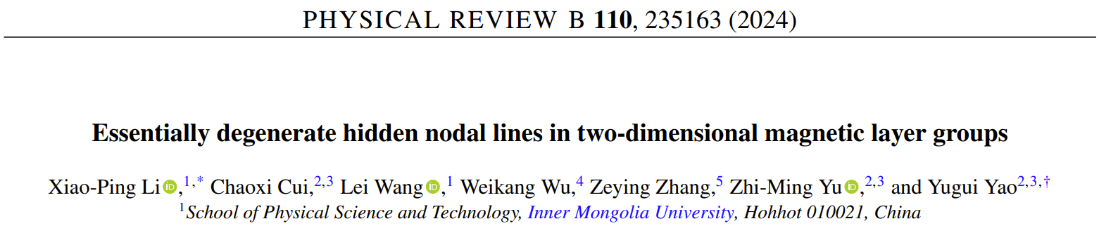 近日,我校物理科学与技术学院李小平研究员团队在拓扑相的理论预言方面取得新进展,在物理学顶级期刊Physical Review B上发表题为“Essentially degenerate hidden nodal lines in two-dimensional magnetic layer groups”的研究成果。(论文链接:https://link.aps.org/doi/10.1103/PhysRevB.110.235163)。李小平研究员为论文的第一作者兼通讯作者,北京理工大学的姚裕贵教授为论文的共同通讯作者。k8凯发为论文第一完成单位。