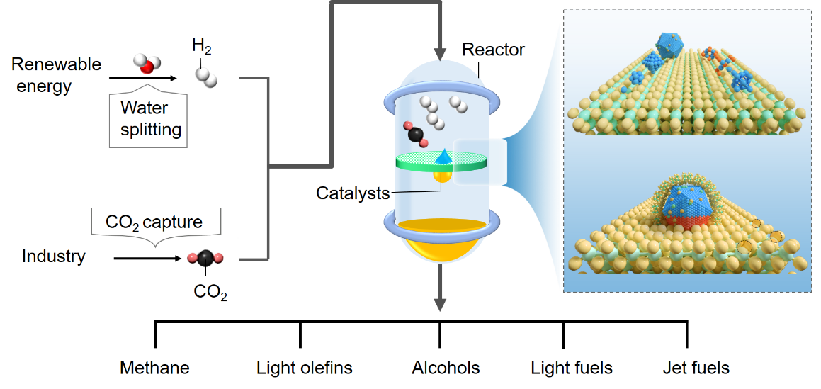 CO2催化加氢可以利用废弃CO2合成附加值化学品,包括C?产物(如一氧化碳、甲烷、甲醇)和C2+产物(如烯烃、乙醇、汽油、航油等),具有良好的工业应用前景。然而,由于加氢混合物产物的分离成本较高,因此产物的高选择性是实现工艺经济性的关键问题之一。由于CO2加氢反应网络复杂,且催化剂表面存在多种活性位点,产物的选择性调控仍面临挑战。