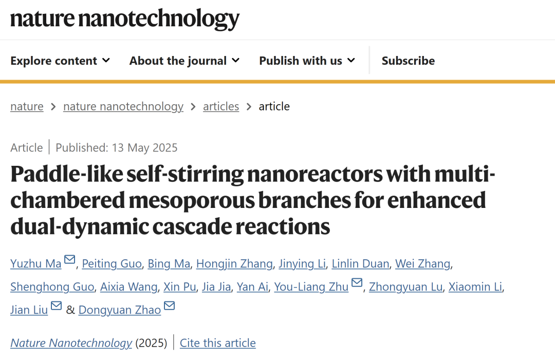 5月13日,我校能源材料化学研究院赵东元院士、马玉柱教授、化学化工学院刘健教授联合吉林大学吕中元、朱有亮教授等人在Nature Nanotechnology期刊上发表了题为“Paddle-like self-stirring nanoreactors with multi-chambered mesoporous branches for enhanced dual-dynamic cascade reactions”的研究成果。 该工作基于前期发展的纳米液滴界面组装策略,设计了复杂分支多腔结构并实现了对结构的精准预测(Nat. Synth. 2024, 3, 236–244.)。基于新型的分支纳米结构,如何构筑智能化的介孔纳米反应器实现结构-功能-应用之间构效关系的匹配一直是本领域的核心挑战(Nat. Rev. Chem. 2024, 8, 915–931.)。基于此,该研究面向新型多腔介孔纳米结构设计,构筑了可以响应外部磁场刺激转化为机械运动的智能纳米反应器,首次提出了类行星式纳米反应器的概念,突破了纳米尺度上分子定向扩散传质的限制,显著提升了级联催化反应效率和反应选择性。 类行星式纳米反应器 研究亮点: 赵东元院士团队通过纳米液滴膨胀和随后的融合策略,设计了一种具有分支多腔结构的桨状介孔纳米反应器(图1),利用分步封装策略可以将功能组分,如Fe?O?纳米颗粒、Pd纳米晶、上转换NaGdF?纳米颗粒(~20 nm)等植入到特定的位置,从而在单粒子水平上构建壳-室、上-下腔和左-右腔分离的杂化二元、三元和四元多功能级联纳米反应器。 将磁性Fe?O?纳米颗粒封装在两个分支的第一个腔室后,该纳米结构在交变磁场下表现出类行星式的自转和公转模式(围绕质量中心,类似于地球自转和公转)。该自转-公转模式提高了混合和扩散效率,更重要的是,可以将更多的分子吸附到催化剂表面,有利于传质和催化效率的提高。 图1: 分支桨状多腔纳米反应器的合成 进一步将Pd和Au催化中心分别落位到分支结构的不同空间位置,构筑了一系列自搅拌纳米反应器(Au-Pd活性位距离不同)。以Au-Pd壳层-内腔分离的自搅拌纳米反应器为例,纳米尺度的自搅拌反应器其初始反应速率相比于传统的宏观机械搅拌提高了一个数量级,从274 mmol h-1 mmol Pd-1提高到2859 mmol h-1 mmol Pd-1。此外,目标产物的产率也从宏观搅拌时的76.8%(选择性为78.1%)上升到纳米搅拌时的95.4%(选择性为96.4%)。同时,调整Au-Pd活性位空间位置(距离)后,可以进一步改变反应分子的扩散路径,进而改变目标产物的选择性。 催化增强机制: 首先,每个分支纳米结构在体系中同时旋转,相当于无数个小转子同时搅拌,从而显著增强反应效率。其次,纳米反应器的自转过程,不仅可以驱动分子由高浓度到低浓度的自发扩散。同时自转过程可以产生指向内腔的反作用力,从而大大增强内扩散过程,甚至可以驱动分子从低到高浓度的反向扩散。这种双动态驱动模式增加了中间体到达下一个活性位点(Au,如本研究中)的概率,从而带动分子的定向扩散。这也调控了分子到达下一位点的概率,进一步优化分子扩散路径,提高产物选择性(图2)。 图2: 自搅拌和催化位点邻近效应的相关性 这项工作揭示了新型多室结构的制备和多个活性位点共定位的设计思路,证明了纳米自旋转和催化位点邻近效应在调节中间体扩散和级联催化性能方面的相关性。这种集成的多功能纳米反应器系统为实现响应外部刺激的新型纳米设计提供了新的思路,为其他应用的拓展奠定了基础。 我校马玉柱教授为一作兼通讯作者,赵东元院士、刘健教授、吉林大学朱有亮教授为该论文的共同通讯作者,论文以k8凯发能源材料化学研究院和化学化工学院为第一通讯单位。该研究得到了国家重点研发计划、国家自然科学基金的资助。 课题组主页:https://www.x-mol.com/groups/ma_yuzhu 全文链接:https://www.nature.com/articles/s41565-025-01915-2 (供稿:能源材料化学研究院 编辑:武涛 审核:刘雪峰 终审:阿茹娜) 上一条:我校蒙古文智能信息处理技术国家地方联合工程研究中心4篇论文被人工智能自然语言处理领域顶级国际会议ACL 2025录用 下一条:我校张嘉汉研究员、刘增研究员团队在国际顶刊《Advanced Materials》上发表重要成果