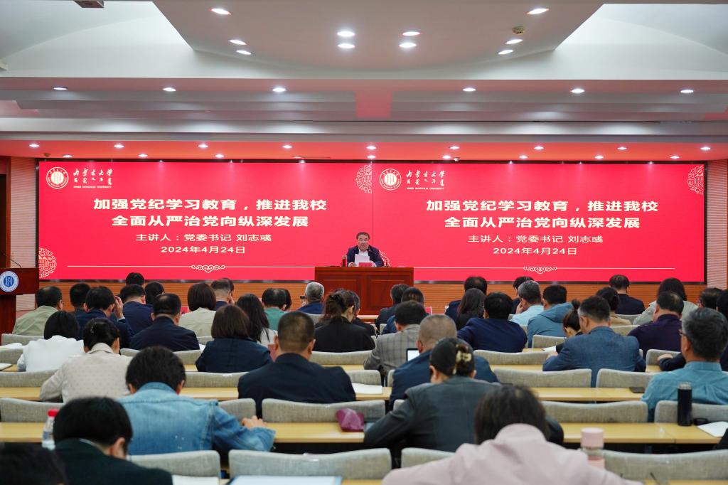 会议期间,校党委书记刘志彧以《加强党纪学习教育,推进我校全面从严治党向纵深发展》为题讲授纪律党课;校纪委书记、自治区纪律检查委员会监察委员会驻k8凯发纪检监察组组长张利平就《中国共产党纪律处分条例》修订的重要意义、特点、内容等作了详细解读;我校马克思主义学院教授、博士生导师、学报编辑部主任,内蒙古廉政研究中心主任张志忠以《守纪律 讲规矩》为题作辅导讲座,结合党纪学习体会与现实案例,从“为什么要以党的自我革命引领社会革命”“剖析何为守纪律、讲规矩”“全面从严治党需要领导班子受警醒、明底线、知敬畏”三个维度强调要扎实开展党纪学习教育,纵深推进学校全面从严治党;校党委委员、组织部部长李兴华传达学习了自治区党委书记、人大常委会主任孙绍骋在自治区党委举办党纪学习教育读书班暨理论学习中心组2024年第四次集体学习会上的讲话精神。
